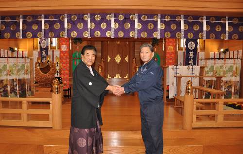 この日は、同社の松本保築社長、工事の棟梁を務めた清水福治専務、清水栄作社寺部長らが神社を訪問。野澤俊雄宮司に関係書類を手渡した後、電気系統や警備などの関係者と共に新社殿の内部を確認した。