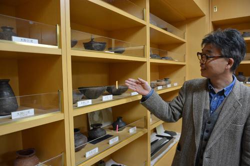 弘前大で保管されている亀ケ岡文化の品々と、同大の関根達人教授=2月、弘前市
