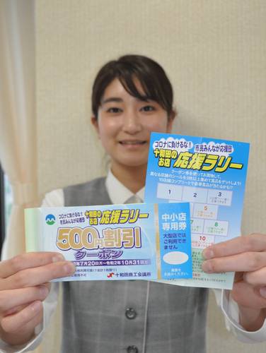 十和田商工会議所(今泉湧水会頭)は20日から、新型コロナウイルスで経済的に影響を受けている事業者と消費者を支えるため、プレミアム付き割引クーポン券を、6千セット限定で発行する。1セットは500円券10枚つづり(5千円分)で、3千円で販売。また、ラリーカード1枚が付いており、取り扱い加盟店でシールを集めて応募すると市の特産品が当たる。[br] 「コロナに負けるな! 十和田のお店応援ラリー」と称した事業で、16日現在、市内の小売業や飲食業など204店が加盟店に登録している。[br] クーポン券10枚のうち、6枚は中小店専用、4枚は全店共通。千円以上の買い物1会計につき、1枚利用できる。1人3セットまで購入可能で、利用期間は10月末。[br] ラリーカードのシールは、購入ごとに1枚配布される。異なる店舗で集めた枚数別に、3枚で千円、5枚で3千円、7枚で5千円、10枚で1万円相当の商品が計275人に当たる。[br] 市民以外を問わず購入でき、同商議所の櫻田一雅専務理事は「売り切れが予想されるので、早めの購入を」と呼び掛けている。[br] 同商議所、十和田湖商工会、十和田奥入瀬観光機構で販売。同商議所のホームページで、同事業の詳細を確認できる。十和田商工会議所が発行するプレミアム付き割引クーポン券とラリーカード=16日