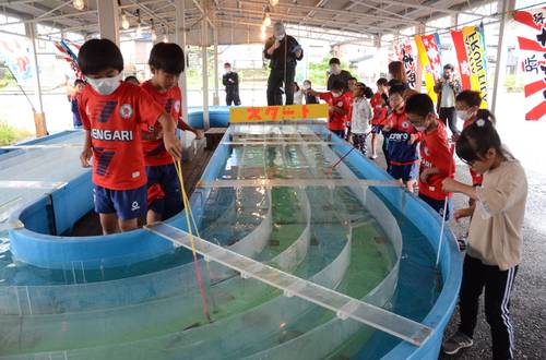 風間浦村活イカ備蓄センターで11日、今季初の「元祖烏賊様(いかさま)レース」が行われた。1周20メートルの特設コースでスルメイカを泳がせて着順を競い、ツアー客らが気まぐれなイカに翻弄(ほんろう)されながら熱戦を繰り広げた。[br] レースは村の恒例行事だったが、近年の不漁を受け、2019年は7月の「ゆかい村海鮮どんぶりまつり」で開催したのみ。18年は極端な不漁で同センター自体が休業を余儀なくされたため、ツアー客などを対象にレースが行われるのは3季ぶりになるという。[br] 同日は、津軽地方から訪れたバスツアー観光客やサッカークラブの子どもたちが体験。勢いよくゴールするイカがいる一方、コースの底にくっついて先に進まないイカもいるなど波乱含みの展開もあり、会場を沸かせていた。[br] 同センターは昨年8月から、水産加工業者の駒嶺商店(同村)が指定管理している。現在のところ、津軽海峡沖のスルメイカは形が小ぶりで漁も薄いというが、同社の駒嶺剛一代表は「下北地域に観光客を呼び込み、にぎわいを創出できれば。漁次第だが11月まで開催したい」と意気込む。[br] レースは5日前までに要予約。6人以上から受け付ける。参加料は1人700円。イカは持ち帰ることができる(近隣市町村限定)ほか、300円追加でさばいて同センター内で食べることができる。営業時間は午前10時~午後2時だが、予約があれば延長対応する。毎週水曜日定休。[br] 問い合わせは風間浦村活イカ備蓄センター=電話0175(36)2112=か、駒嶺商店=電話0175(35)2211=へ。烏賊様レースを楽しむ子どもたち 【全文】