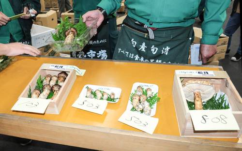 本格的なシーズンでないとは言え、香りはマツタケそのもの。競りでは6本入り290グラムに1万6千円の値が付いた。しぶとい梅雨ですっきりしない日が続くが、高級食材の恵みがあると思えば我慢できるかも。