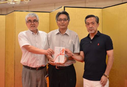 金澤幹雄会長(中央)に寄付金を贈呈する髙橋敏会長(左)と川村義明会長