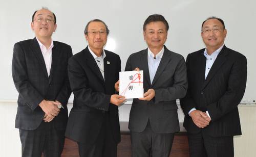 柏谷弘陽教育長(左から2人目)に10万円を寄付した小川和一代表(左から3人目)