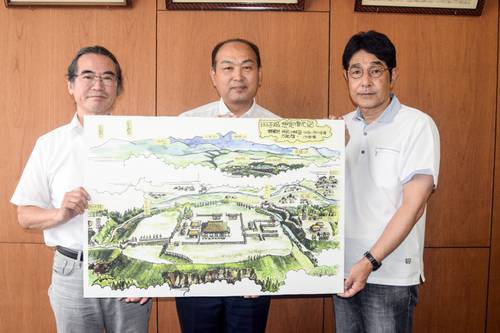 在りし日の田子城が目の前に―。三戸町在住の画家、田村まさよしさん(75)と、ごのへ郷土館(五戸町)の木村明彦館長(62)が11日、田子町役場に山本晴美町長を訪ね、水彩風景画「田子城想像復元図」の完成を報告した。1500年代に田子城を居城とした南部家26代当主信直、27代当主利直の歴史を伝えるため、町が製作を進める「歴史の窓」風景画の第1弾。今後、南部家ゆかりの風景を“続編”として作画し、町内に案内板として設置する予定。