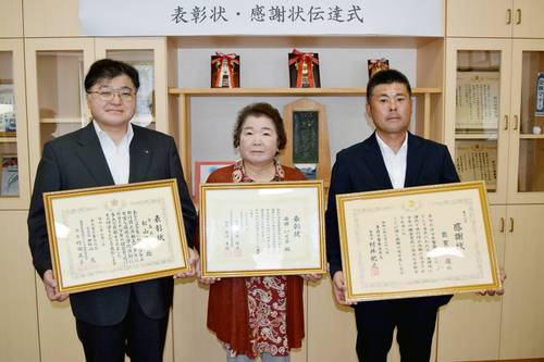 表彰状と感謝状が伝達された(左から)松山隆志さん、西濵いく子さん、敦賀一俊さん