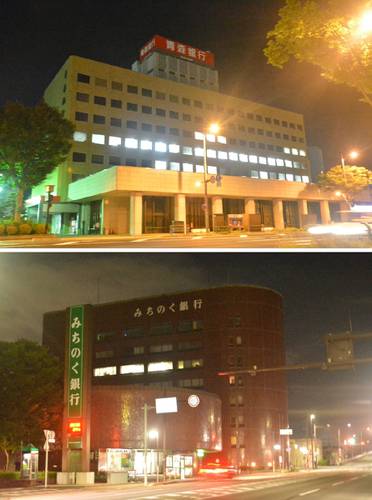 経営統合に向けた協議に入った青森銀行(上)とみちのく銀行の本店=4日、青森市