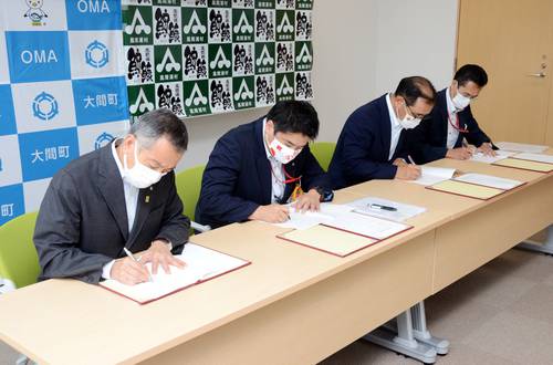 協定書にサインする(左から)金澤満春町長、大間郵便局の堺辰也局長、冨岡宏村長、風間浦郵便局の田澤博明局長