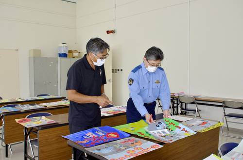 ポスターを審査する金澤幹雄会長(左)と高屋保幸署長