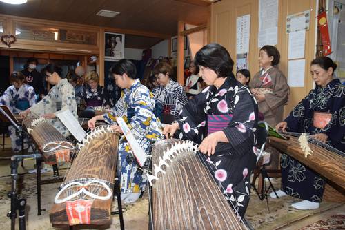 カナダ国歌などを演奏し動画の収録に臨む「おこと教室『和・輪・わ』の会」のメンバー