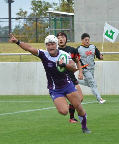 【準決勝・青森北―三農】前半29分、三農は阿部光希(左)がトライを決め、5―5の同点とする=青森県新総合運動公園球技場