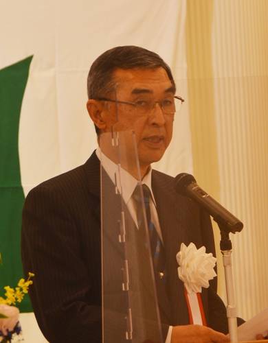 東北地方治水大会であいさつする全国治水期成同盟会連合会の脇雅史会長=27日、青森市