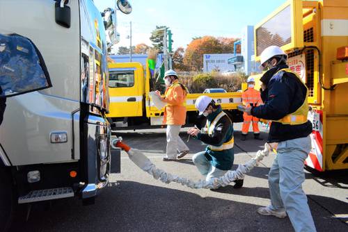 大雪で立ち往生した大型車両のけん引手順を確認した訓練