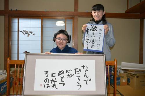 障害の垣根を越えて書を楽しむことを目的に活動する、八戸市のボランティア書道教室「俊文書道会」(西里俊文代表)のメンバーで、青森県立八戸第一養護学校中学部2年の蛇平蒼大(じゃたいそうた)さん(13)が、公募展「第5回筆文字で伝えたいことば大賞」の学生の部で最高賞の大賞に輝いた。同じく一般の部では同会の村井喜代子さんが入選。生徒2人の同時受賞に同会の会員らは喜びに沸いている。[br][br] 公募展は日本デザイン書道作家協会の主催。学生の部に1231作品、一般の部に977作品の応募があった。[br][br] 「なんでだろう 心がひとつになれるのは」と、素直な気持ちを力強い筆致で表現した蛇平さん。大賞に輝くのは2018年に続き2回目で、「普段の生活で思っていることを言葉に託した。これからもいろんな公募展に挑戦していきたい」と目を輝かせる。[br][br] 子どもの頃から書道を続けていたという村井さんは、「のらりくらり時には激しい雷のように生きる」と字体や線の強弱を工夫した作品で入選。「これからも書道会のみんなでいい作品を作ろうという気持ちで書を続けていけたら」と思いを強くする。[br][br] 教え子の快挙に西里代表は「受賞は会員みんなの励み。これからもたくさんの人を驚かせるような作品を生み出してもらえれば」と話している。受賞を喜ぶ蛇平蒼大さん(左)と村井喜代子さん 【全文】