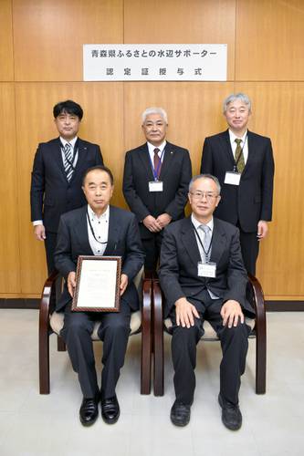 青森県は7日、河川や海岸などの美化活動を行うボランティア「県ふるさとの水辺サポーター」に、八戸市のアクア設備を認定した。活動区間は同市尻内町矢沢の浅水川(340メートル)で、今後、草刈りやごみ拾いを定期的に行っていく。[br][br] 三八地域では同社が36団体目、浅水川の担当は7団体目となった。[br][br] この日は県八戸合同庁舎で認定証授与式が行われ、県三八地域県民局地域整備部の佐々木正昭部長が、同社の苫米地勝志会長に認定証を手渡した。[br][br] 苫米地会長は「古里の川を大切に残していくため、従業員一同、頑張っていきたい」と決意を述べた。記念写真に納まる、アクア設備の苫米地勝志会長(手前左)ら関係者