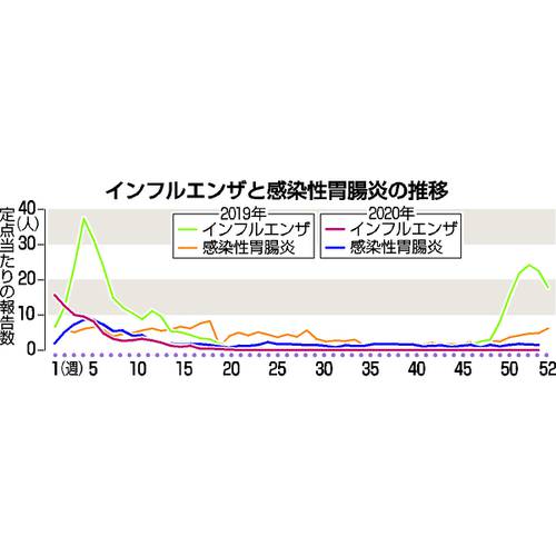 新型コロナウイルスの感染拡大が続く中、青森県内でインフルエンザの感染患者が激減している。感染報告は11月9日から12月20日まで6週間連続でゼロを記録。感染性胃腸炎の原因となるノロウイルスも例年より少ない。県民の間で手洗いやマスク着用といった新型コロナの予防対策が徹底されたことで、いつもは12月に流行期に入る感染症に歯止めが掛かっているようだ。