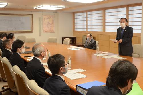 知事査定の冒頭、予算編成の方針を語る三村申吾知事(右奥)=26日、青森県庁