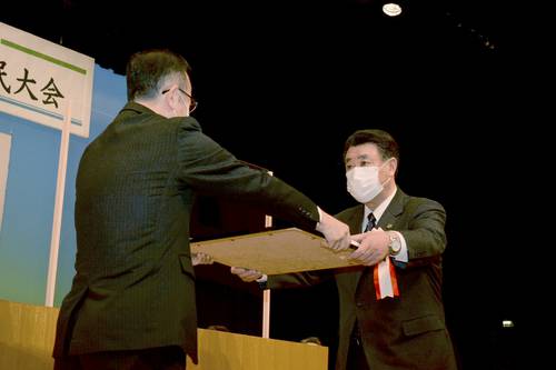 特別表彰を受ける元山形村長の清水恭一さん(右)