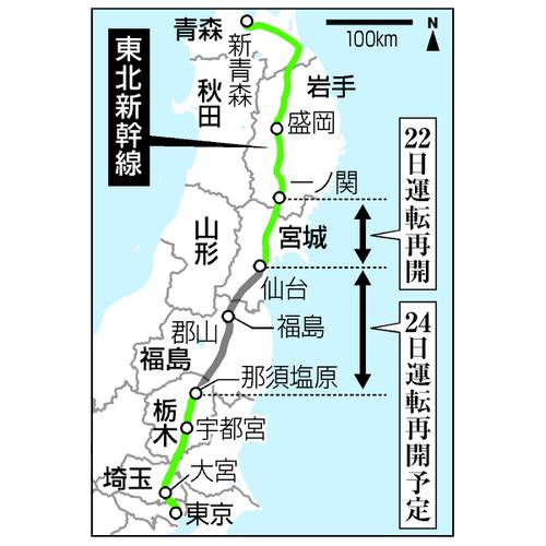 福島、宮城両県で震度6強を観測した13日の地震により一部区間で運転を見合わせていた東北新幹線は22日、仙台―一ノ関(岩手県)間で運転を再開した。JR東日本は22日、全線復旧して運転を再開する24日以降の臨時ダイヤを発表。当面の間、運行本数が.....