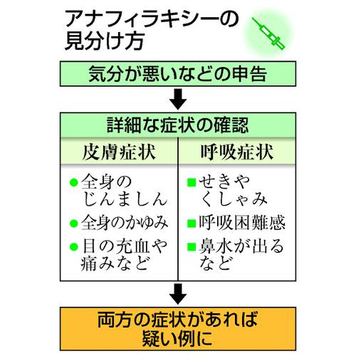 新型コロナウイルスのワクチンを巡り、米製薬大手ファイザー製品の接種が進む日本でも副反応の報告が集まりつつある。重いアレルギー「アナフィラキシー」を疑う例が続いたが、症状の似た別の反応と間違う可能性もあり、12日の厚生労働省専門部会では「医療現場が判断に迷う」との議論に。女性に多いことから、化粧品が影響したとする見方も浮上している。[br][br] ▽割合 [br][br] 「アナフィラキシーに該当しないケースもあった」。12日、専門部会長の森尾友宏・東京医科歯科大教授は、国に報告された中には別の副反応が含まれているとの見解をまとめた。[br][br] 医師や看護師らへの接種を進める国内の病院が9日までに厚労省に報告した17人のうち、国際基準で認定されたのは7人。ある委員は、医療機関ごとに副反応の解釈がまちまちになっている現状があると指摘した。[br][br] 米国でも、接種を始めて間もない昨年12月に、重いアレルギーと報告された175人のうち認定されたのは21人だった。接種が始まったばかりの日本と同様に、医療現場でアナフィラキシーなどを判断することが難しかったようだ。[br][br] ▽ストレス[br][br] 実は新型コロナに限らず、予防接種後にめまいや冷や汗、血圧の低下など、アナフィラキシーに似た症状が出ることが知られている。よくある原因の一つが「血管迷走神経反射」だ。[br][br] 精神的な緊張、ストレスから自律神経のバランスが崩れて起きるとされる。気分や顔色が悪くなるだけでなく、失神が起きることもある。他のワクチンでも100人に1人ほどの頻度でみられるが、安静にしていれば回復する。今回は新型コロナの予防接種が強いストレスになった可能性がある。[br][br] 国立病院機構三重病院(津市)では、ワクチンを接種された医療従事者が血管迷走神経反射と診断された。勤務する長尾みづほ医師(アレルギー学)は「敏感で、注射が苦手な人や疲れている人がなりやすい」と指摘する。アナフィラキシーであれば血圧低下などに加えて息苦しさやせきといった呼吸器の症状、じんましん、かゆみなどの皮膚の症状が両方出る。[br][br] 三重病院は独自に判別の図を作成し、接種会場に掲示。その後に血液検査などで副反応を検証する準備を進めている。[br][br] ▽因果関係[br][br] 新型コロナの場合、予防接種後のアナフィラキシーは女性が多い。日本の7人も女性だ。[br][br] このため、化粧品の一部に含まれる「ポリエチレングリコール」が、ファイザーや同じ米国のモデルナの製品に含まれることと関係しているとの説が注目を浴びている。[br][br] アレルギーは、原因となる物質を過去に体内に取り込んだ経験があると起きやすくなるからだ。国内では、専門家から化粧品との因果関係を調べるべきだとの声も高まっている。[br][br] ただし、ワクチンの予防効果は非常に高いとされる。世界最速のペースで接種が進むイスラエルでは、2度の接種により感染や発症、重症化が90%以上食い止められたと米医学誌で報告された。[br][br] 日本感染症学会ワクチン委員会の委員長を務める西順一郎鹿児島大教授(感染症学)は「打つ意義は高いと思う」と訴えている。