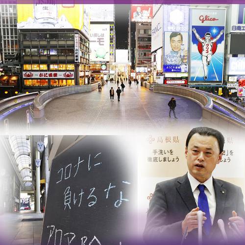 緊急事態宣言下で閑散とする1月の大阪・道頓堀を背景に、丸山達也島根県知事(右下)、地方の商店街に置かれたボード(左下)のコラージュ