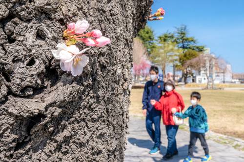 青森県内は2日、高気圧に覆われ、晴れ間が広がった。八戸市の三八城公園では、ここ数日の陽気に誘われて、木の幹に花を付ける胴吹きのソメイヨシノがほころび、市民に春の訪れを告げていた。
