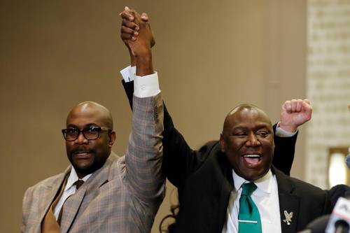 米黒人男性暴行死事件の評決後の記者会見で、手を上げ喜ぶ遺族(左)と弁護士=20日、ミネアポリス(ロイター=共同)