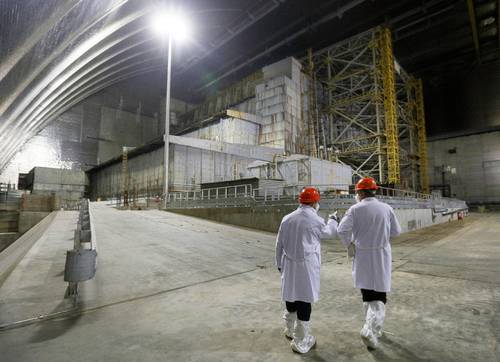 鋼鉄製シェルターの内部で「石棺」と呼ばれるコンクリートの構造物に覆われたチェルノブイリ原発=15日(AP=共同)