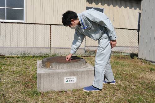 階上町役場の敷地内に設置されている震度計=4月中旬、同町道仏