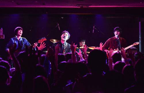 活動再開を発表した「空想委員会」の3人。(左から)岡田典之さん、三浦隆一さん、佐々木直也さん=2019年3月21日、八戸市のライブハウス「フォーミー」で開かれたライブ