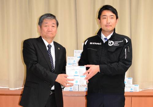 ビルメンテ会社が三沢市教委に弱酸性電解水を寄贈